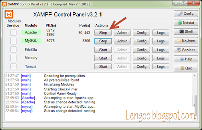 Klik Start seperti pada contoh gambar, pada bagian APACHE dan MySQL. Apabila Control Panel Memberikan respon dengan warna hjau itu artinya service sudah siap untuk digunakan, jiga memberikan warna kuning itu artinya service sedang dipersiapkan, dan jiga memberika warna merah itu artinya service rusak/ tidak dapat digunakan.